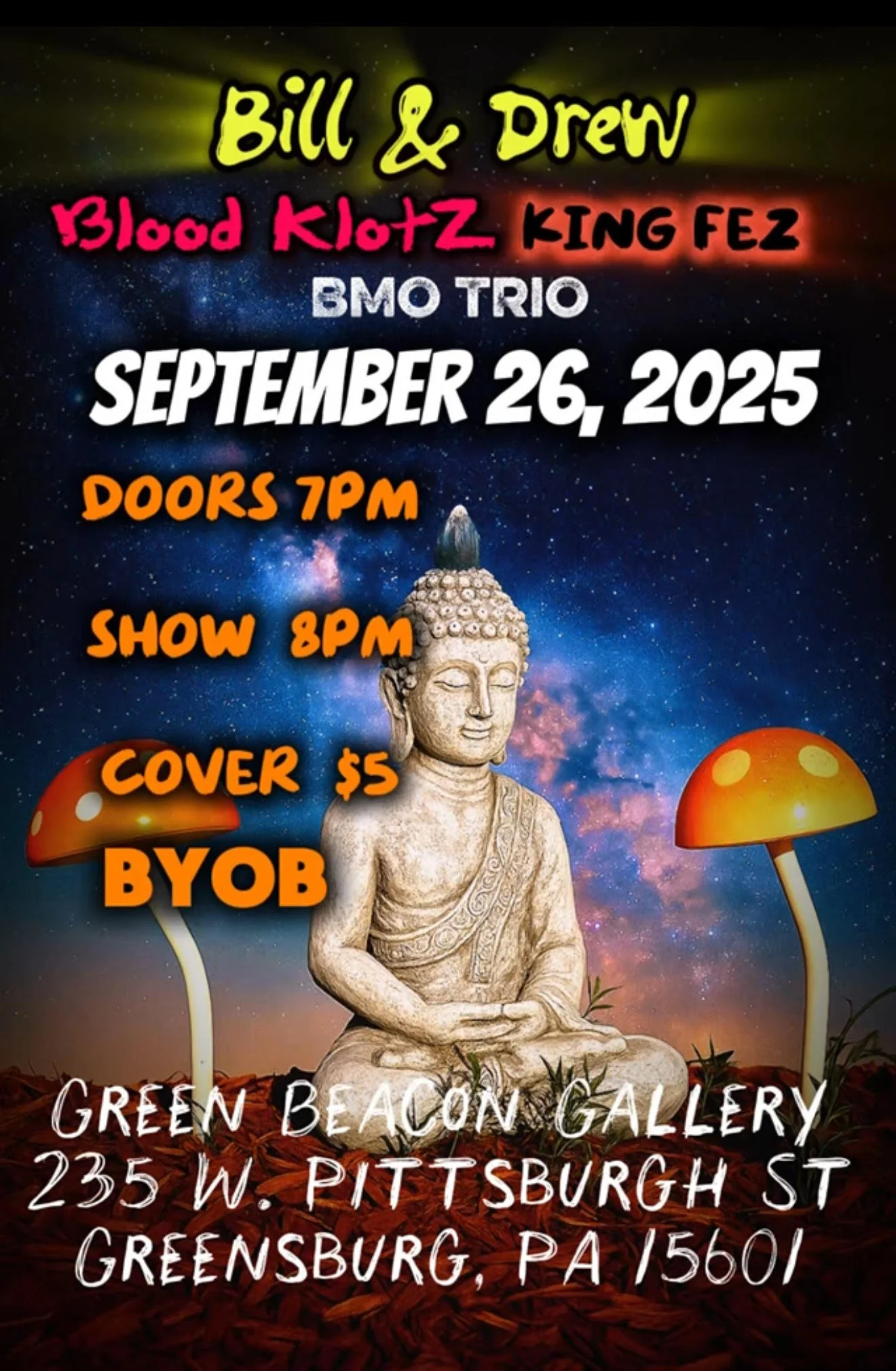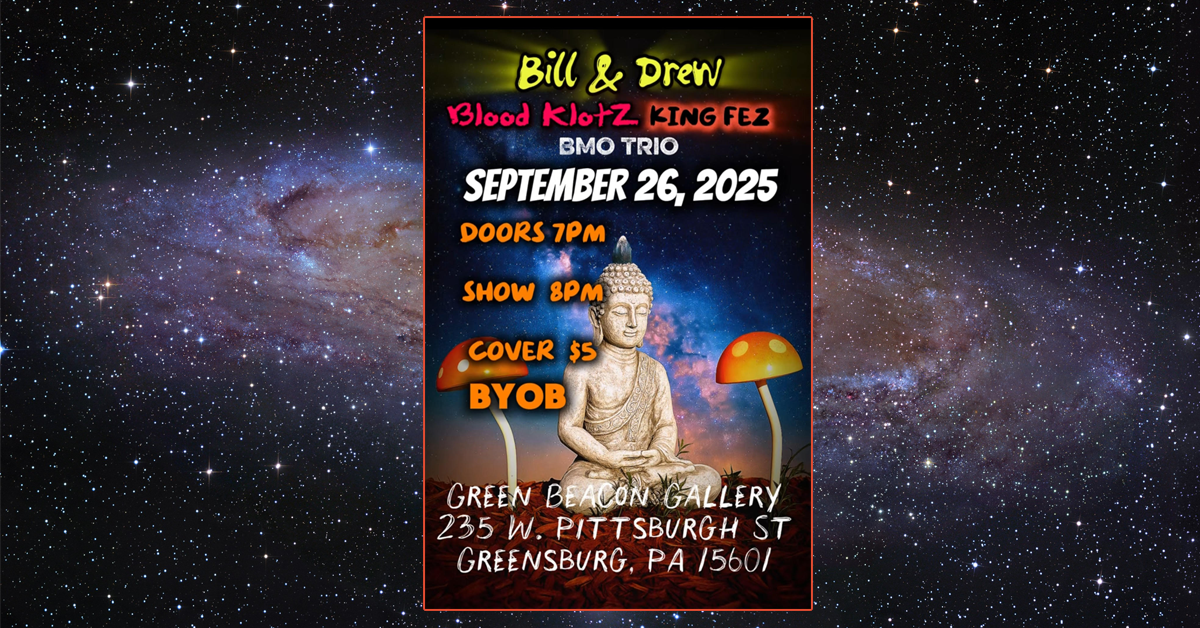 Free street parking, also in the Albright Parking Lot located behind gallery (GPS to "Offut St. Greensburg, PA 15601"). Please enter through the front entrance on Pittsburgh St. All gallery artwork will be available for purchase before and after the show. Seating is LIMITED, be sure to come early to get a chair!