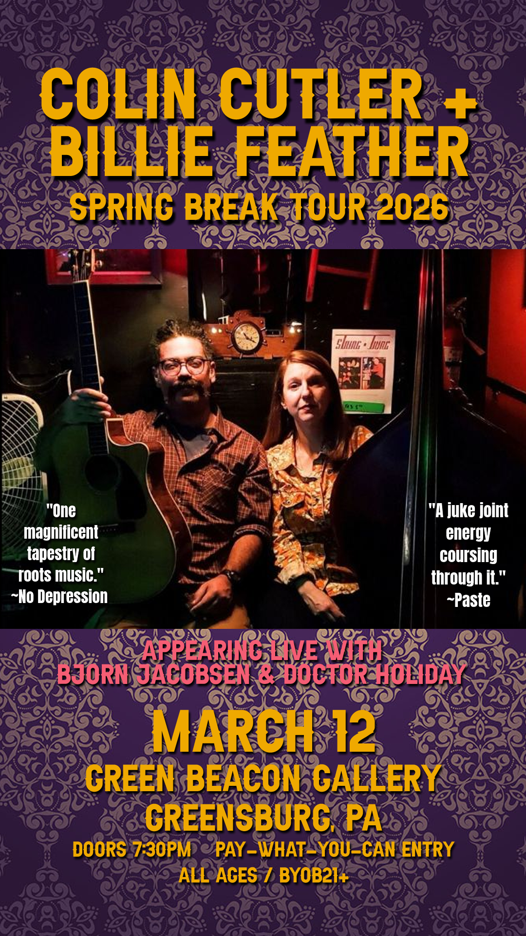 Swing through the Beacon for a lil dose of Thursday Night Delight! Bear ye witness to americana and folk from North Carolina's Colin Cutler & Billie Feather on their Spring Break Tour!