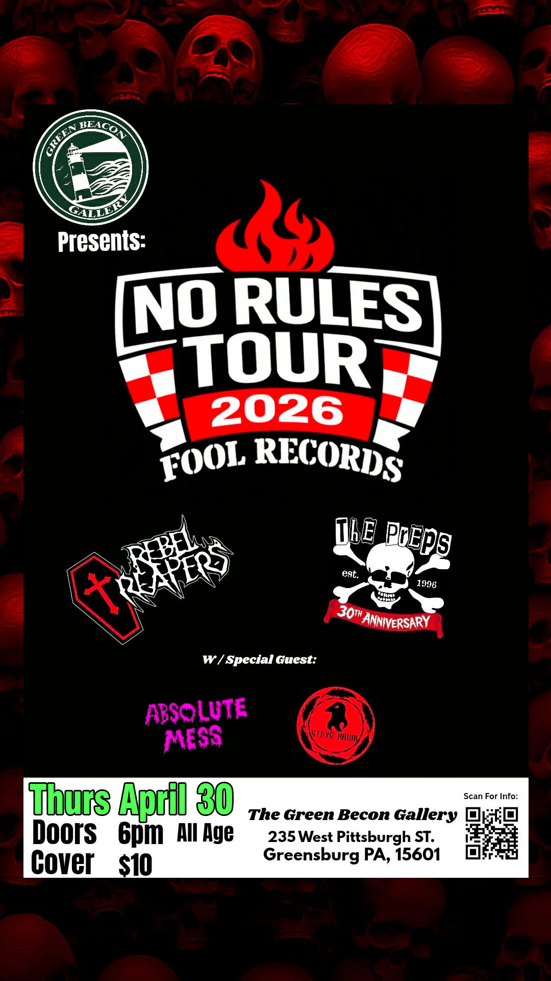 Thurs April 30, 2026 Doors 6:00pm // Music 7:00 All ages // BYOB21+ with valid ID $10 cover