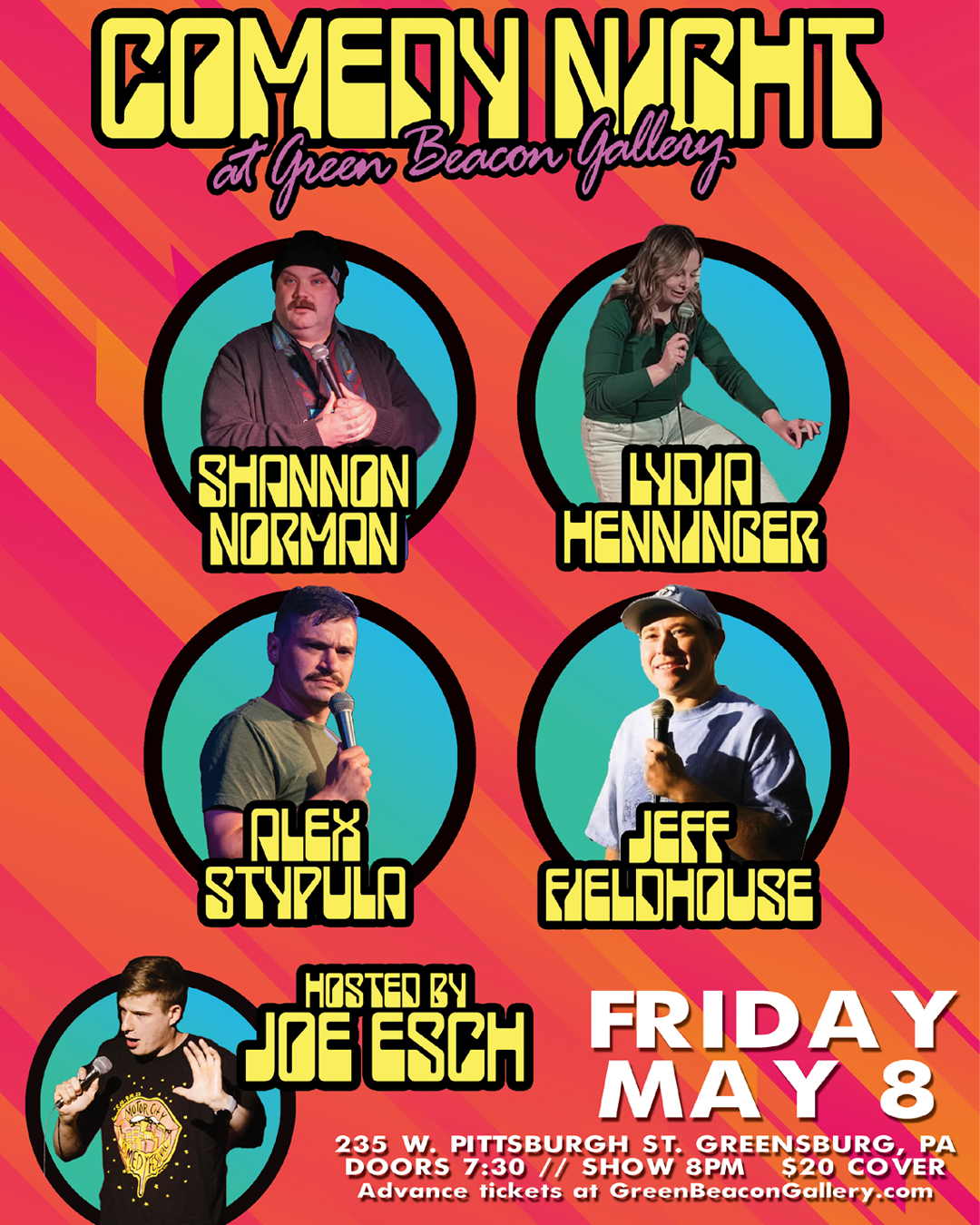 Free parking in the large lot located behind gallery (GPS to "Offut St. Greensburg, PA 15601"). Please enter through the front entrance on Pittsburgh St. All gallery artwork will be available to browse & buy before and after the show. Seating is LIMITED, be sure to come early to get a chair!